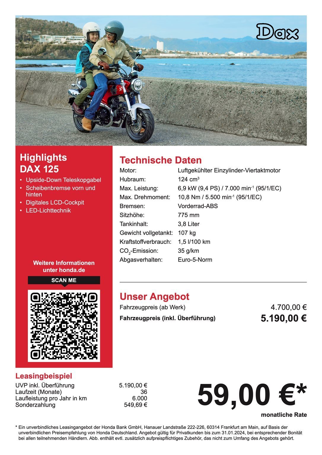 • Ein unverbindliches Leasingangebot der Honda Bank GmbH. Hanauer Landstraße 222-226. 60314 Frankfurt am Main. auf Basis der unverbindlichen Preisempfehlung von Honda Deutschland. Angebot gültig für Privatkunden bis zum 31.01.2024. bei entsprechender Bonität.